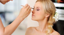 Young beautiful bride applying wedding make-up