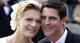 German Alpine ski racer Hoefl-Riesch and sports manager Hoefl pose for photographers after wedding ceremony in Going