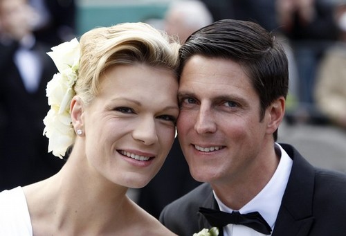 German Alpine ski racer Maria Hoefl-Riesch and sports manager Marcus Hoefl pose for photographers after their wedding ceremony in Going April 16, 2011. REUTERS/Michaela Rehle (AUSTRIA – Tags: ENTERTAINMENT SPORT SKIING)
