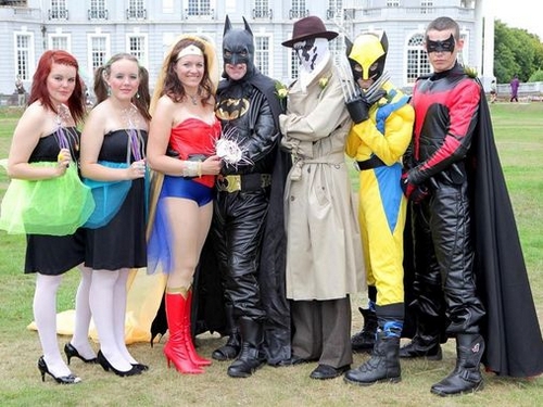 Quello che vedete in foto non è il matrimonio tra Batman e Wonder Woman, ma di due appassionati di fumetti, il signor Neil Vaughan e la signora Sharon Wetherell, che hanno scelto i costumi dei loro beniamini per convolare a nozze. E con loro non potevano mancare invitati super eroi: Iron Man, Hulk (guai a non lasciargli una tartina), Robin, Joker, (quest’ultimi due erano i testimoni) Superman, Poison Ivy, Lara Croft, Bananaman, gli incredibili e molti altri.