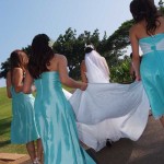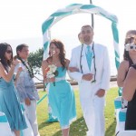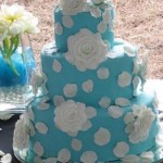 In questa cerimonia l’abito della sposa era azzurro così come lo erano le decorazioni delle sedie, i tovaglioli, i nastri degli inviti e le scatolette utilizzate come semplici bomboniere. La torta era anch’essa azzurra decorata con petali bianchi.