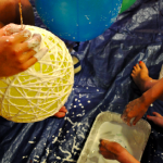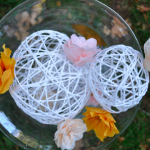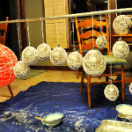 Ve li sintetizzo: gonfiate un palloncino; disegnate un cerchio intorno al nodo, grande quanto la lampadina che eventualmente vorrete inserire nella sfera (altrimenti saltate il passaggio); applicate sullo stesso uno spago ricoperto di colla vinilica mescolata con acqua e amido di mais e lasciate asciugare per ventiquattro ore. Fate scoppiare il palloncino e cadere gli eccessi di colla che si saranno “cristallizzati” e spruzzate il tutto di vernice.