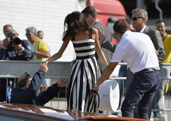 George Clooney (R) and Amal Alamuddin (C), his Lebanon-born British fiancee take a taxiboat upon their arrival in Venice, on September 26, 2014, on the eve of their wedding. AFP PHOTO / ANDREAS SOLARO (Photo credit should read ANDREAS SOLARO/AFP/Getty Images)