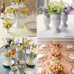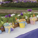 Nei secchielli di metallo colorato sono poste uova a tema pasquale, ma anche piccoli stuzzichini. Come centrotavola sono stati scelti fiori, perlopiù eleganti tulipani, in portauovo, cestini di vimini e piccoli vasi. Al centro di tutto è il colore: molto giallo e glicine come potete vedere nelle foto, che sono perfetti sia per la Pasqua che per la primavera.