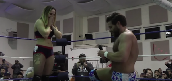 Impegnato sul ring insieme alla sua fidanzata il wrestler Joey Ryan ha scelto un momento di pausa dell’incontro per chiedere alla propria ragazza di sposarlo.
