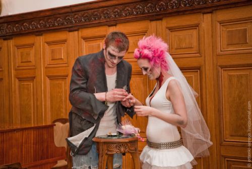 Chi ad Halloween non sa che fare, può sempre pensare di sposarsi e di prendere ispirazione dal Matrimonio Zombies presentato nella gallery che segue. I Matrimoni Zombies esistono, vengono celebrati realmente, con tanto di scambio delle fedi, corteo nuziale e ricevimento. E chissà se il tasso di divorzio tra gli Zombies, che si promettono amore per l’eternità, sia più basso di quello umano!