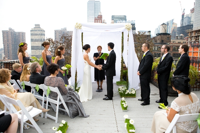 Contornati da alti palazzi, su un terrazzo ampio addobbato a festa, ecco che gli sposi convolano a nozze e non mi sembra che sia poco romantico!