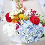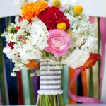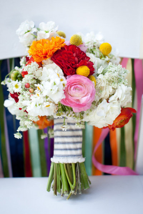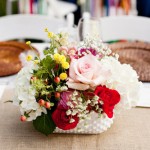 Per i centrotavola è sufficiente prendere un mazzo di bei fiori, senza utilizzare vasi, e legarli insieme con un tessuto colorato: righe o fiori sono perfette.
