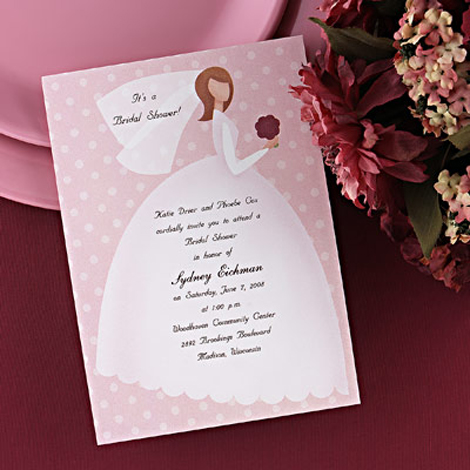 Carta rosa con i pois per le partecipazioni e la sagoma di una longilinea sposa con un vestito a campana nel quale vengono posizionate le scritte: nome degli sposi, giorno delle nozze, luogo della cerimonia e orario.