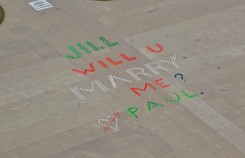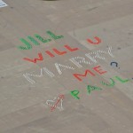 Paul ha utilizzato dei coni spartitraffico colorati per formare una gigantesca scritta sulla pista dell’aeroporto: Jiil will u marry me? Paul – Jill vuoi sposarmi? Paul.