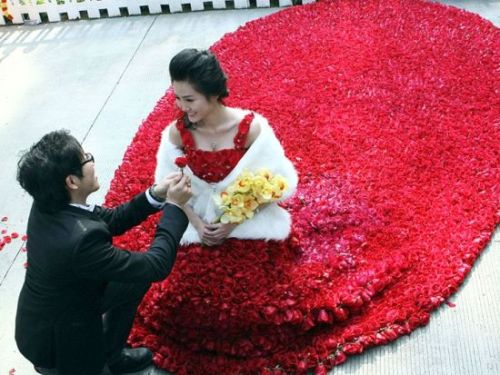 Mai viste tante rose rosse tutte insieme: è veramente mozzafiato il vestito che la neo fidanzata di quest’uomo originale indossa. Yin Mi è una donna fortunata: non tanto perché sta per sposare un compagno sicuramente benestante, ma perché una proposta del genere fa sentire amate, speciali e uniche!