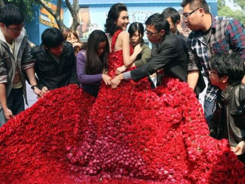 Xiao Fan è un uomo evidentemente romantico (e probabilmente ricco): anziché la classica dozzina di rose ha fatto realizzare per la sua amata un vero e proprio abito da sogno composto di ben 9999 rose rosse. Dalle foto che potete vedere in apertura la ragazza è raggiante: e chi non lo sarebbe, di fronte a tale tripudio di romanticismo e sfarzo?