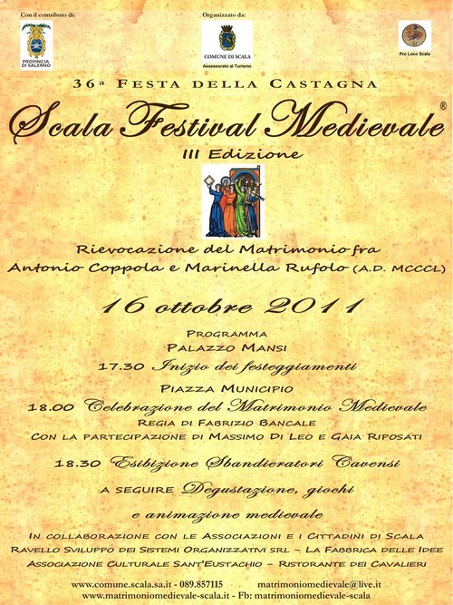 Gran successo ieri per il Matrimonio Medievale, una rappresentazione storica riproposta in occasione della XXXVI edizione della Festa della Castagna di Scala, nella costiera amalfitana. La rievocaziona narra dell’unione tra i due patrizi Antonio Coppola e Marinella Rufolo, rampolli delle famiglie di Scala e Ravello, voluta dalla Regina Giovanna I per sugellare la pace.