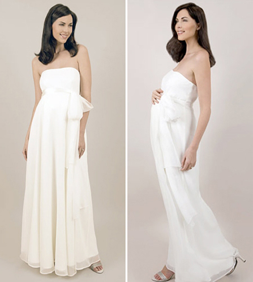 Le spose in genere scelgono l’abito che poi viene ritoccato dalle sarte, lo stesso si può fare nel caso di pancione prominente altrimenti un abito stile impero sarà perfetto, stretto sotto il seno e morbido in vita.