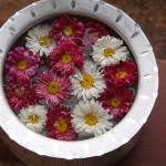 Un bel vaso trasparente o anche colorato, sempre a tema, può stare benissimo come centrotavola per gli invitati. Se volete, invece, potete essere più creative e magari pensare a tagliare via i gambi dei fiori per poi farli galleggiare, come nella figura, in vasi più piccoli e bassi.