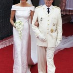 Sposa numero due: Charlene Wittstock, fasciata in un fiabesco abito di Giorgio Armani che valorizzava il suo fisico atletico addolcendone la silhouette. Una linea a sirena non eccessivamente fasciante con coda all’Andrienne e delicatissime decorazioni, realizzate con 40 mila cristalli di swarovski e 30 mila perline dorate.