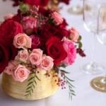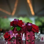 Centrotavola di rose rosse, bordeaux, rosa, con nastri dello stesso colore che decorano i vasi. Boutonierre per lo sposo in bordeaux oppure rosso sangue di bue, intenso e scuro. Mescolato al rosa per creare effetti di colore, o anche al bianco, per riprendere l’abito della sposa.