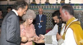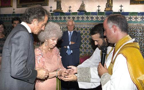 SEVILLA, 05/10/2011: Duchess of Alba Cayetana Fitz-James Stuart, and Alfonso Diez Carabantes speak to priest Ignacio Jiménez Sánchez at Duenas Palace in Seville, Spain on October 5th, 2011.( Pool by EFE/ Jose Manuel Vidal via Getty Images)