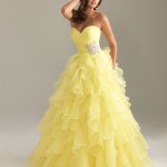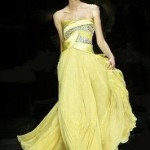 Ma torniamo alle idee a colori da catturare al volo per il vostro di matrimonio. Se avrete delle damigelle, ecco un abito scivolato con gonna plissé e corpetto ricamato di cristalli o in alternativa l’abito con profilo argento che mette in risalto il decolleté. E se siete folli, osate e scegliete voi un abito giallo, magari con la gonna a rouches e il corpetto a cuore, oppure un modello da star in chiffon con inserti illuminati da cristalli.