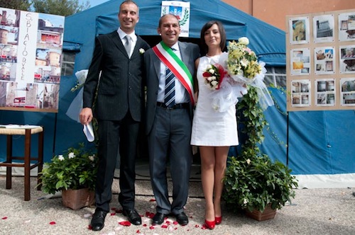 Nonostante qualche iniziale riserva manifestata anche e soprattutto da mia moglie, sull’opportunità di svolgere la cerimonia in tenda, alla fine abbiamo di buon grado deciso di rispondere positivamente alla richiesta venuta dall’amministrazione comunale. È, in fondo, un piccolo gesto, il nostro, con il quale vogliamo dare sostegno alle legittime proteste di tutta la nostra comunità che chiede risposte sul problema della ricostruzione